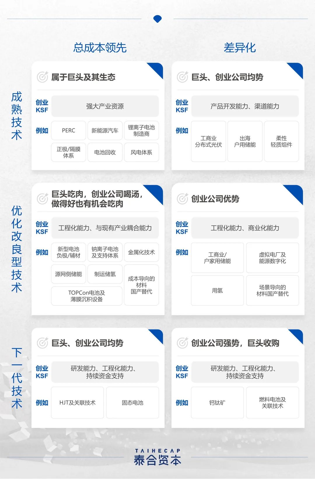 技術(shù)層面,出于商業(yè)價(jià)值的差異化戰(zhàn)略和出于安全價(jià)值的國產(chǎn)替代主題,是可以捕捉的價(jià)值來源。此外,產(chǎn)業(yè)鏈的持續(xù)迭代帶來了“增量”機(jī)會(huì),而抓住有限的技術(shù)領(lǐng)先時(shí)間窗口,平衡新技術(shù)和現(xiàn)有產(chǎn)業(yè)鏈的耦合、尋找“拐點(diǎn)”成為了價(jià)值的最主要來源。商業(yè)模式層面,可簡化為“總成本領(lǐng)先”和“差異化”兩類。