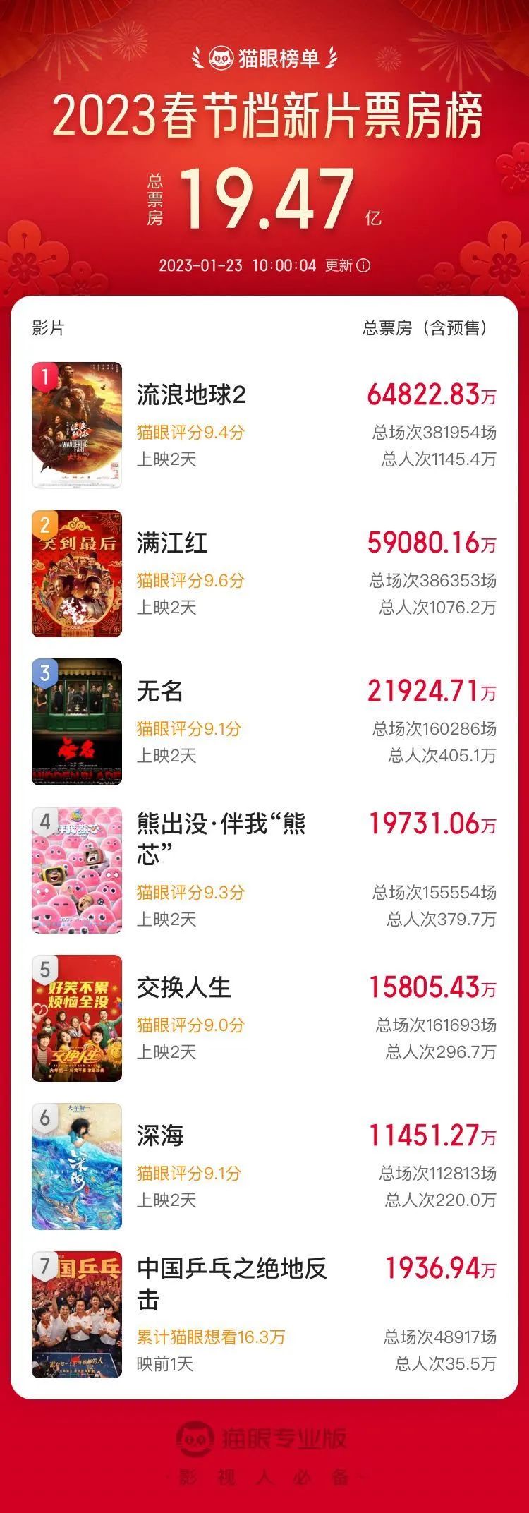截止1月23日10時(shí),春節(jié)檔新片票房榜 數(shù)據(jù)來源:貓眼數(shù)據(jù)專業(yè)版