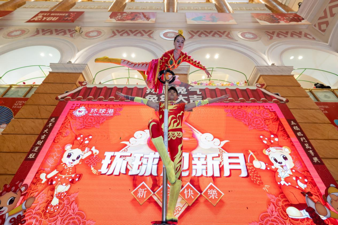 新春期間,上海環(huán)球港將新年風(fēng)俗與民族文化演藝相融合,每日精彩不停歇,開展唐樂演奏、雜技表演、新春歡樂大巡游等一系列充滿年味的互動(dòng),如:丹青妙筆賀新春、編織中國結(jié)、福筒插花、新春掛飾燈籠DIY、新春剪紙、福畫印制、迎財(cái)神、兔個(gè)上上簽等,顧客在這里可以近距離體驗(yàn)傳統(tǒng)中國年,瞬間穿越千年前,一起感受國風(fēng)帶來的魅力,迎接佳節(jié)喜氣。