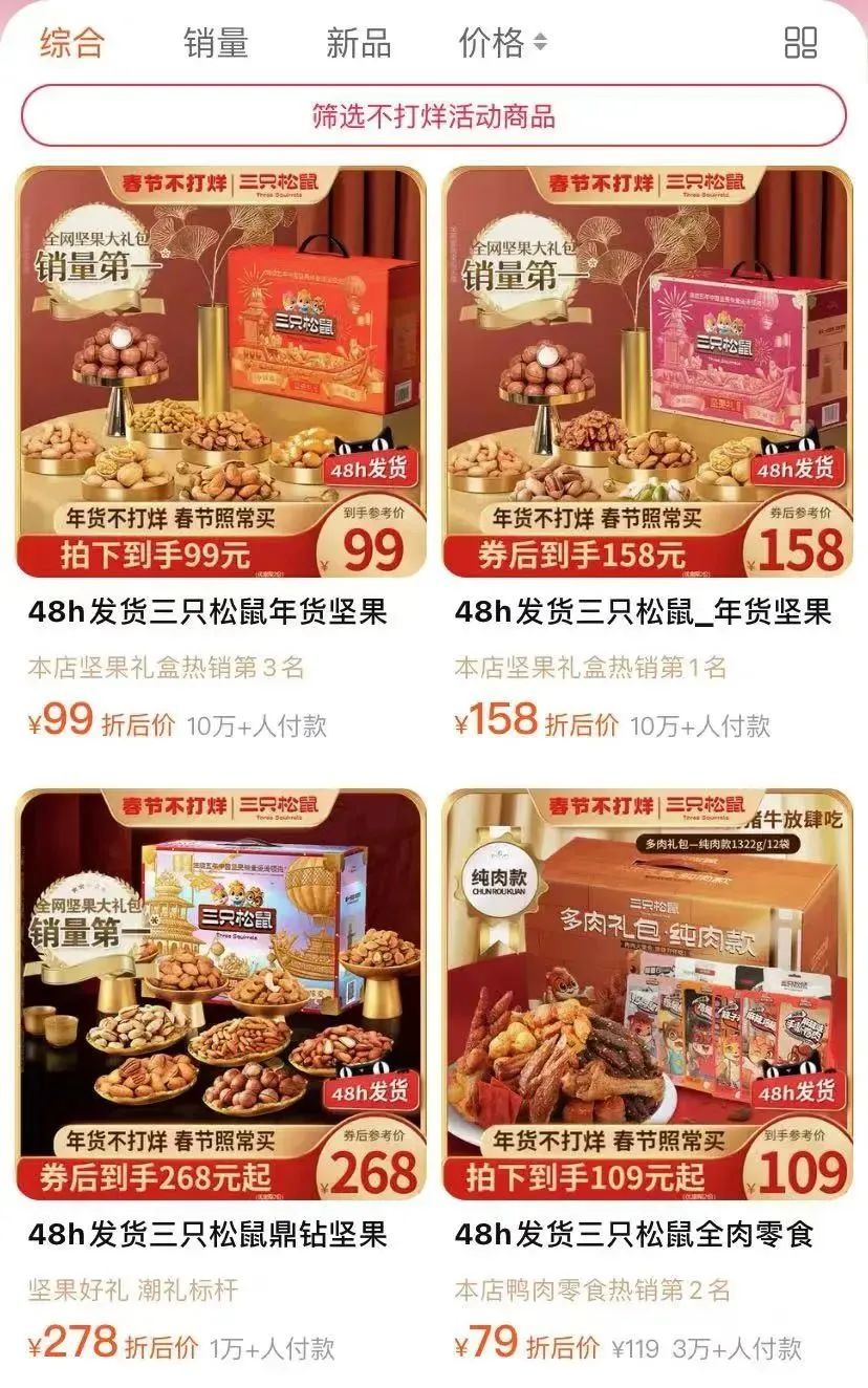 在春節(jié)期間,家庭自備年貨,走親訪友贈(zèng)送禮品,亦或者是公司回饋員工、送客戶等,三只松鼠、良品鋪?zhàn)觽兊膱?jiān)果禮包都是熱門的產(chǎn)品。在電商平臺(tái)上的“年貨節(jié)”中,它們也是零食領(lǐng)域的“主角”。