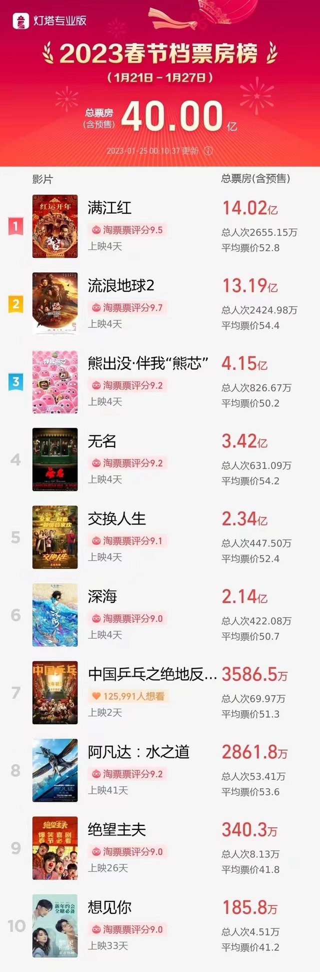 據(jù)燈塔專(zhuān)業(yè)版實(shí)時(shí)數(shù)據(jù),截至1月25日0時(shí)10分,2023年春節(jié)檔(1月21日至1月27日)總票房(含預(yù)售)突破40億元!稘M(mǎn)江紅》《流浪地球2》《熊出沒(méi)·伴我“熊芯”》分列春節(jié)檔票房前三位,且前兩部影片均突破13億元。