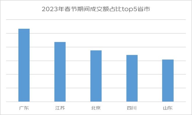 年味足,消費旺,這個春節(jié)期間各地消費市場都呈現(xiàn)出旺盛的活力。京東銷售情況顯示,截至1月26日,2023春節(jié)期間成交額占比最高的省市是廣東省、江蘇省、北京市、四川省和山東省。春節(jié)期間天津市津南區(qū)、北京市通州區(qū)和重慶市沙坪壩區(qū)增速領(lǐng)跑全國,成交額同比增長分別達436%、311%和126%。
