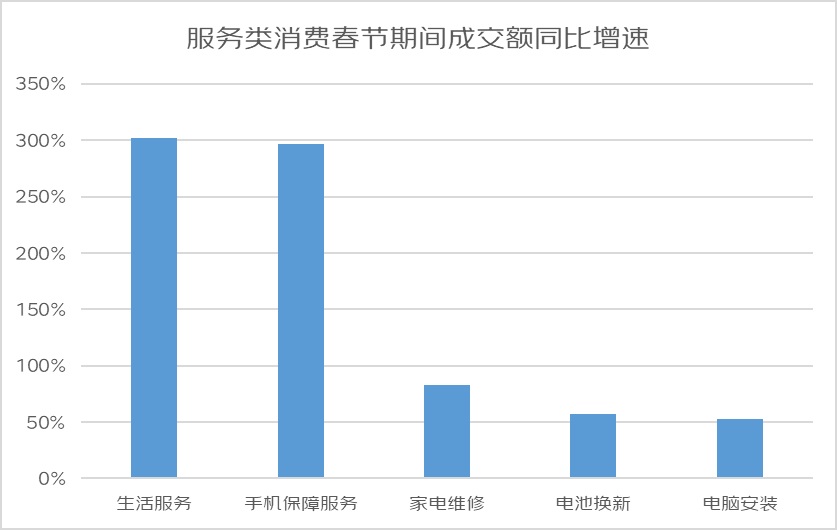 同時,除了在春節(jié)期間購買心儀好物外,服務(wù)消費也受到了眾多消費者的喜愛,春節(jié)期間生活服務(wù)、手機保障服務(wù)、家電維修、電池換新和電腦安裝的成交額同比增長分別達302%、296%、83%、57%、53%。
