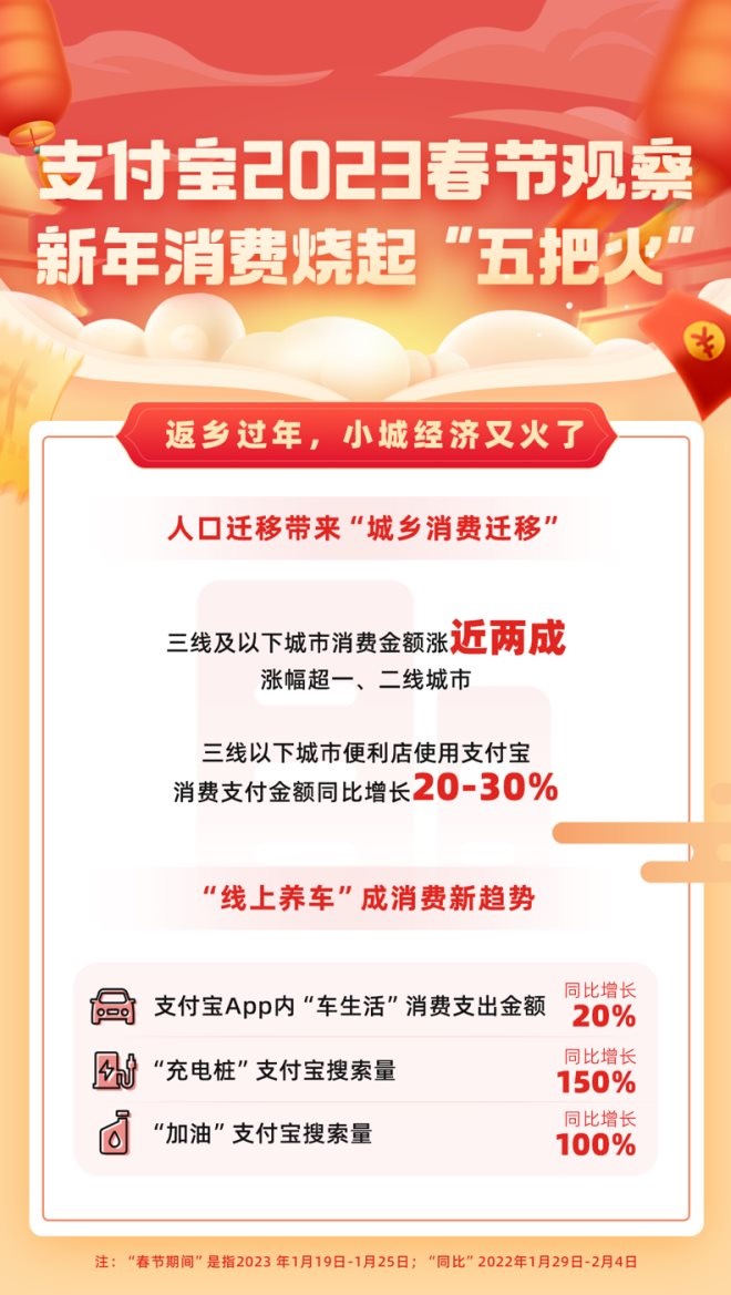 1月27日,支付寶發(fā)布2023年春節(jié)消費(fèi)觀察——新年消費(fèi)燒起5把火,居民消費(fèi)熱情加速回歸。