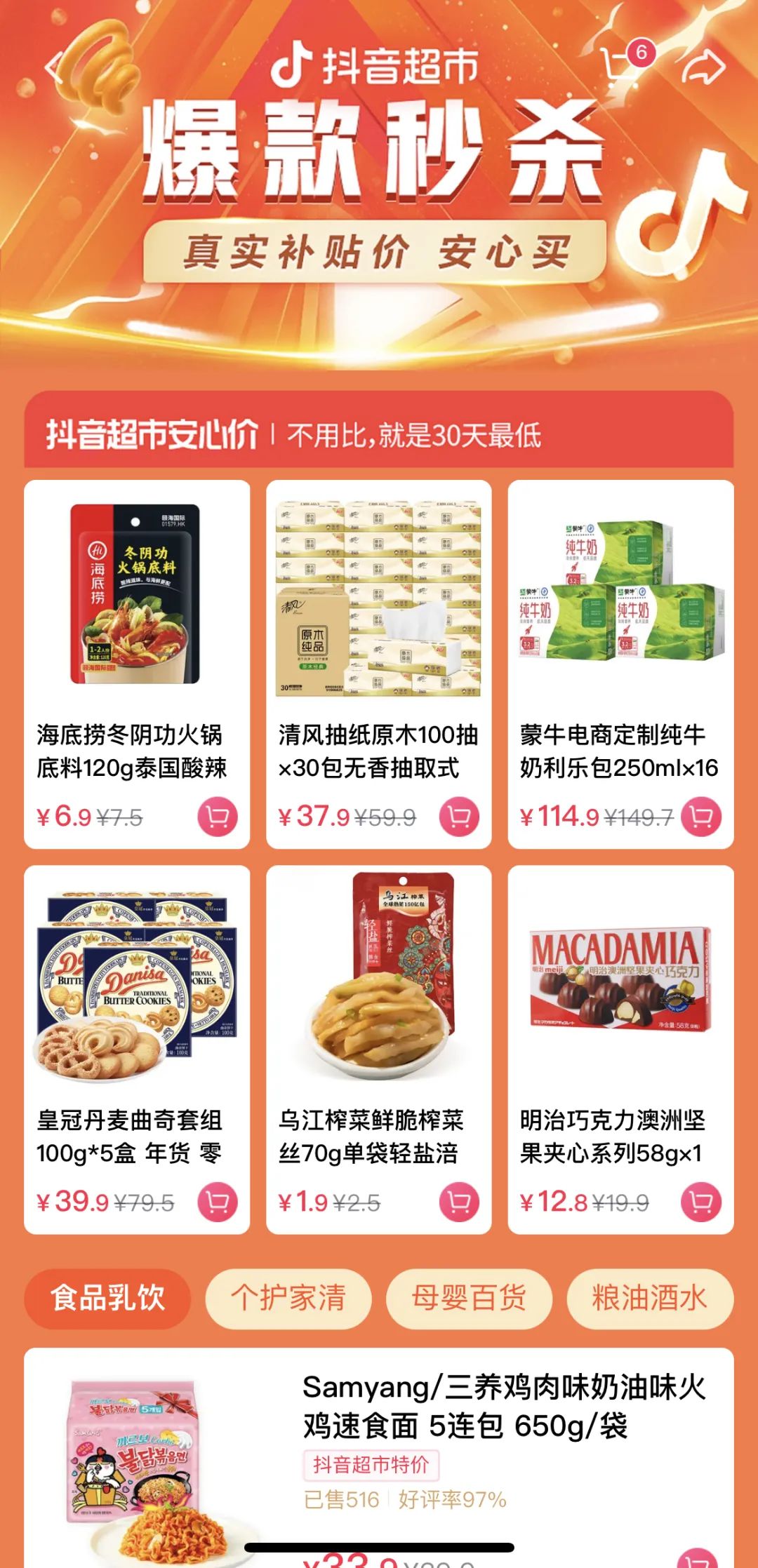 Tech星球發(fā)現(xiàn),抖音超市還推出了每日上新的“爆款秒殺”活動,并強調(diào)“真實補貼價,安心買”、“不用比,就是30天最低”。
