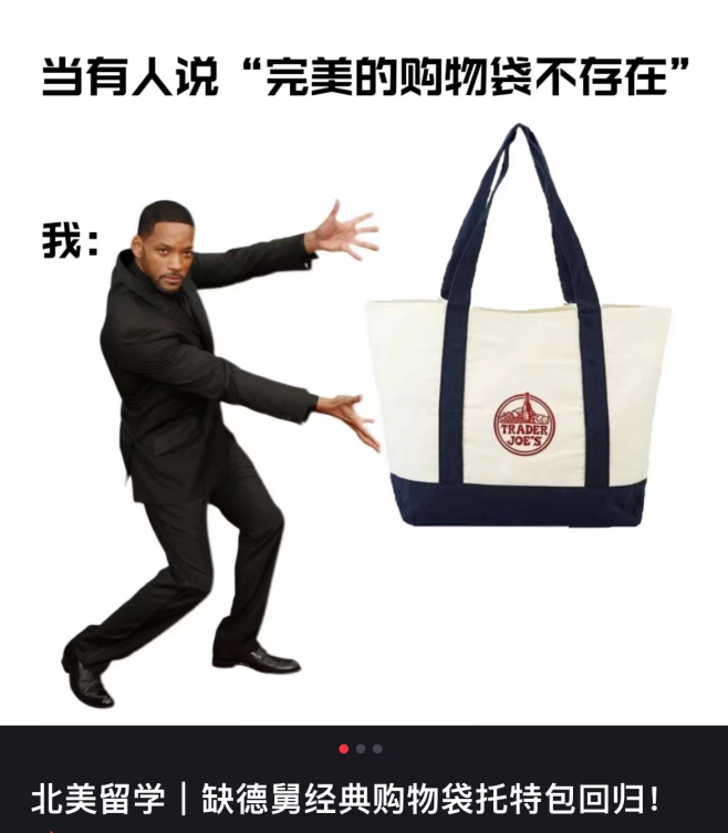 Trader Joe's甚至還打造了屬于自己的“購物袋文化”。當(dāng)一款經(jīng)典的藍(lán)白購物包回歸時(shí),甚至在社交平臺引起了一段美國留學(xué)生的集體回憶。