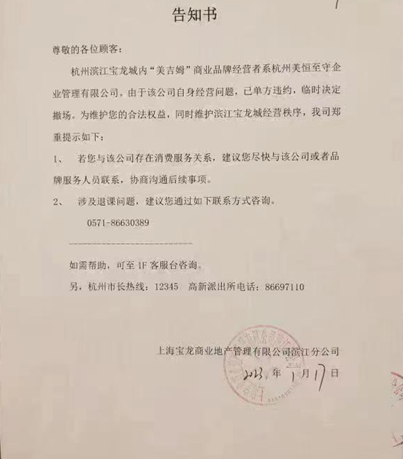 此前,1月17日,上海寶龍商業(yè)地產(chǎn)管理有限公司濱江分公司曾發(fā)布告知書,稱該店品牌經(jīng)營(yíng)者杭州美恒至守企業(yè)管理有限公司由于自身經(jīng)營(yíng)問(wèn)題,已單方違約,臨時(shí)決定撤場(chǎng)。