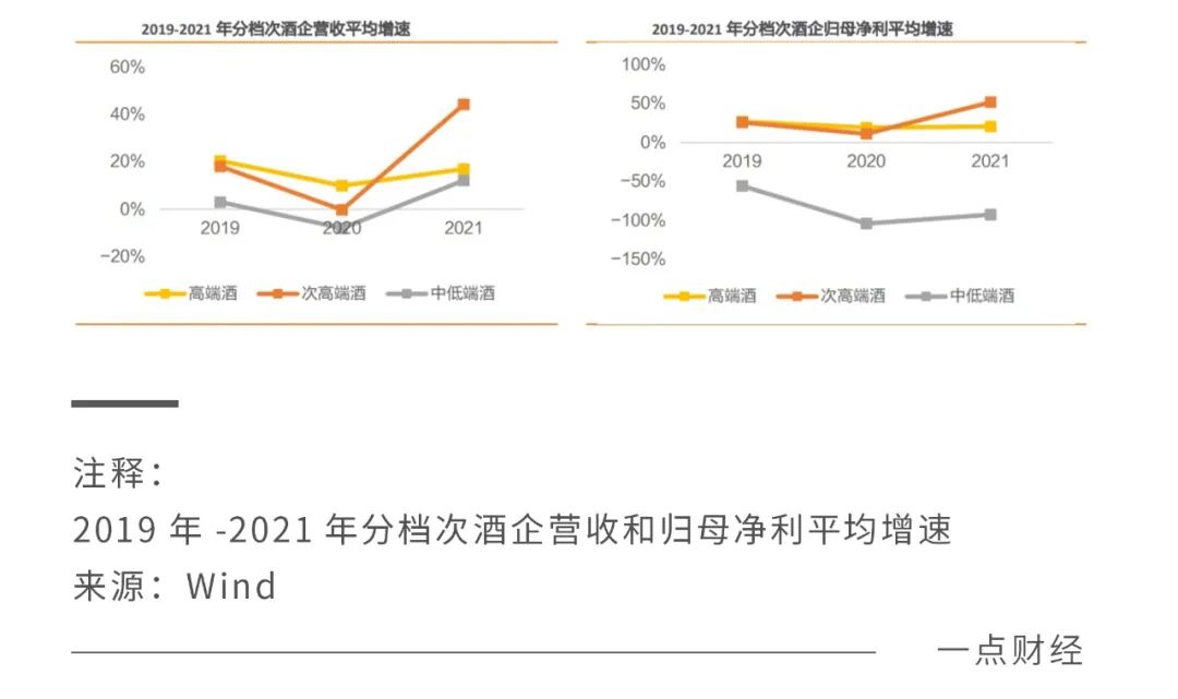 比如,茅臺(tái)批價(jià)的持續(xù)拔升,給酒企在千元價(jià)格帶打開(kāi)空間。高端千元價(jià)格帶的打開(kāi),為次高端600元-800元及300元-500元價(jià)位騰出上漲空間,價(jià)格梯隊(duì)上的“高帶低”為酒企業(yè)績(jī)注入了持續(xù)動(dòng)力。Wind數(shù)據(jù)顯示,2019年-2021年在分檔次酒企營(yíng)收和歸母凈利平均增速上,高端酒和次高端酒增速明顯高于中低端酒。