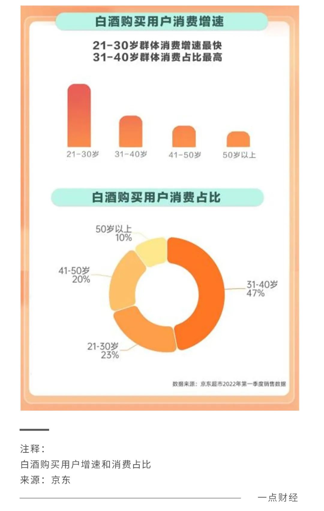 年輕人是未來(lái),也是眾多消費(fèi)品牌實(shí)現(xiàn)基業(yè)長(zhǎng)青的密碼,在白酒行業(yè)將同樣印證這種生存邏輯。京東超市《2022年一季度白酒消費(fèi)趨勢(shì)報(bào)告》顯示,21-30歲的白酒購(gòu)買用戶消費(fèi)占比為23%,消費(fèi)增速最快。31-40歲的白酒購(gòu)買用戶消費(fèi)占比為47%,41-50歲占比為20%。