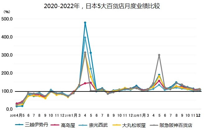 再看2020年以來,5個主力百貨店的月度業(yè)績比較(下圖),有兩個主要特點,一是和疫情政策有密切相關。2020年4月份,嚴格控制政策發(fā)布以后,百貨店業(yè)績瞬間掉到谷底,下降80%以上,2021年3月份適當放松以后,4月份業(yè)績迅速提升,2022年3月份以后,控制政策放開,5月份業(yè)績也是出現大幅反彈,說明疫情控制政策對百貨店業(yè)績構成直接的因果影響。二是,總體向好,各企業(yè)的業(yè)績逐漸恢復。以2021年5月份三越伊勢丹、崇光西武為主要代表,構成3年來的標桿業(yè)績。2022年5月份的大阪阪急百貨店業(yè)績增長十分搶眼,帶動阪急阪神百貨整體業(yè)績領先于行業(yè)。