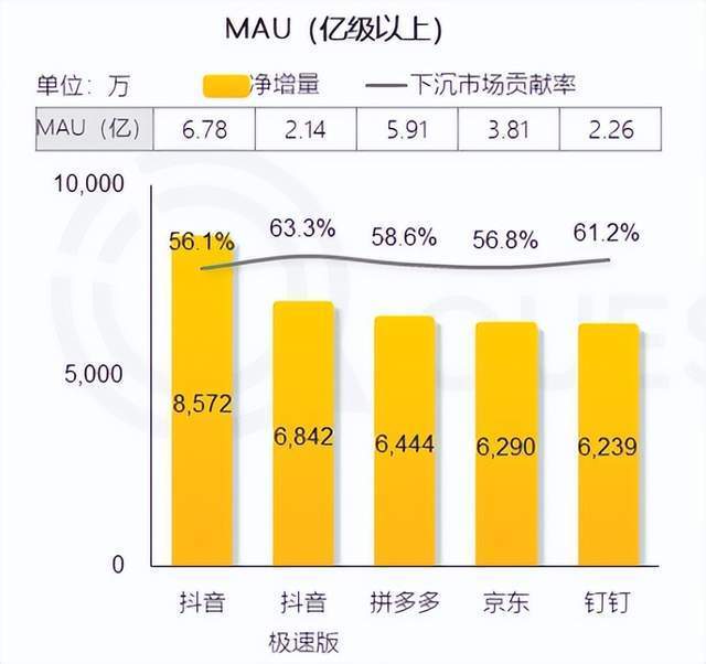 去年上半年抖音(含極速版)、拼多多、京東三個MAU在億級以上的APP,來自下沉市場新用戶貢獻(xiàn)率均超過50%。其中,抖音極速版多達(dá)63.3%的新用戶來自下沉市場。