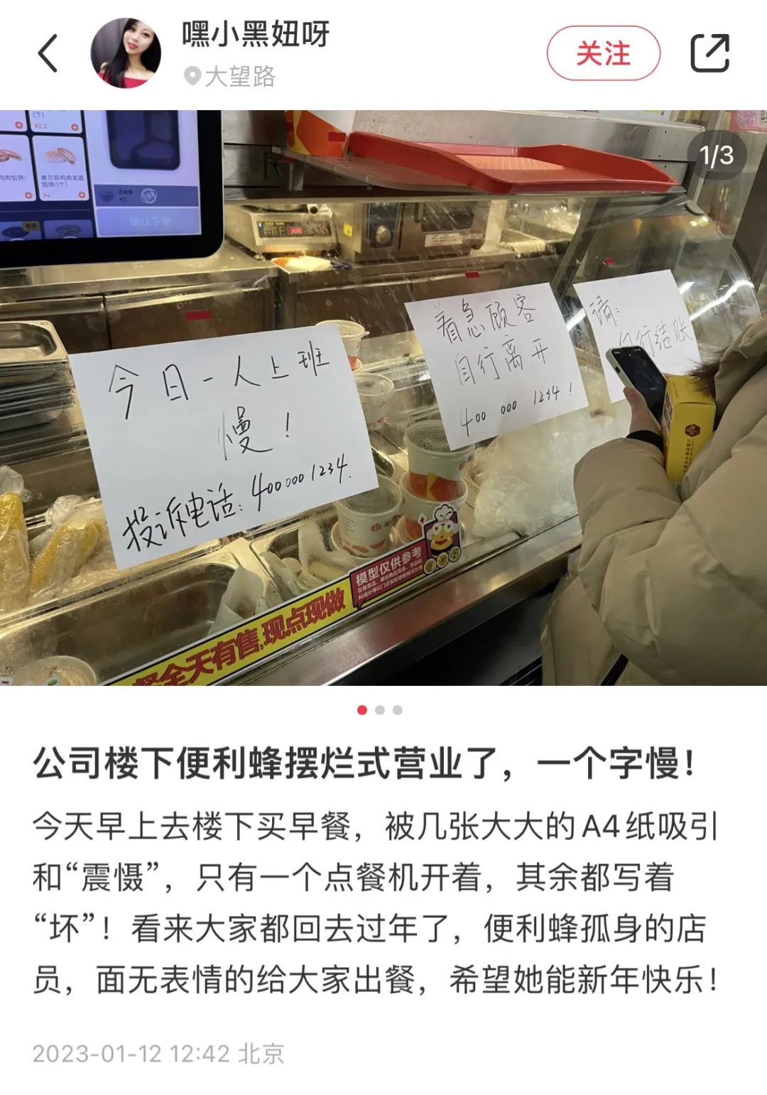 便利蜂擺爛,早已開始無(wú)差別攻擊北京打工人。小紅書博主@嘿小黑妞呀年前吐槽公司樓下便利蜂擺爛式營(yíng)業(yè)。
