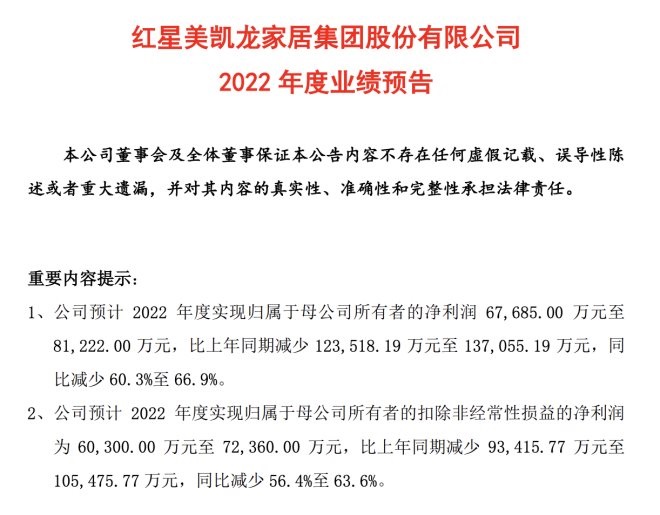 紅星美凱龍預(yù)計(jì)2022年凈利同比減少60.3%-66.9%