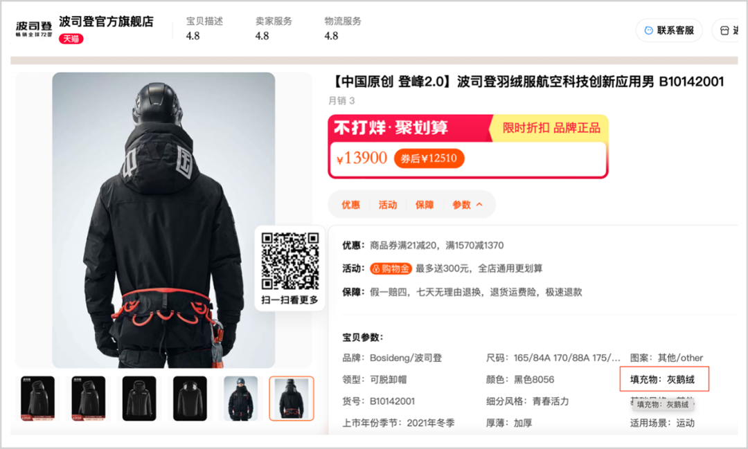 波司登號稱“登峰2.0”采用了“1000蓬5A級珍稀鵝絨”,從天貓旗艦店中可知,其采用的也并非白鵝絨,而是灰鵝絨。