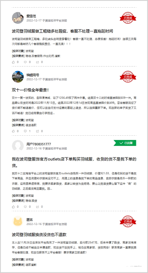在黑貓投訴平臺上,對波司登的投訴已經(jīng)有800多條,遠高于同行,投訴問題主要集中在產(chǎn)品質(zhì)量差、虛假宣傳、售后服務不到位等問題。