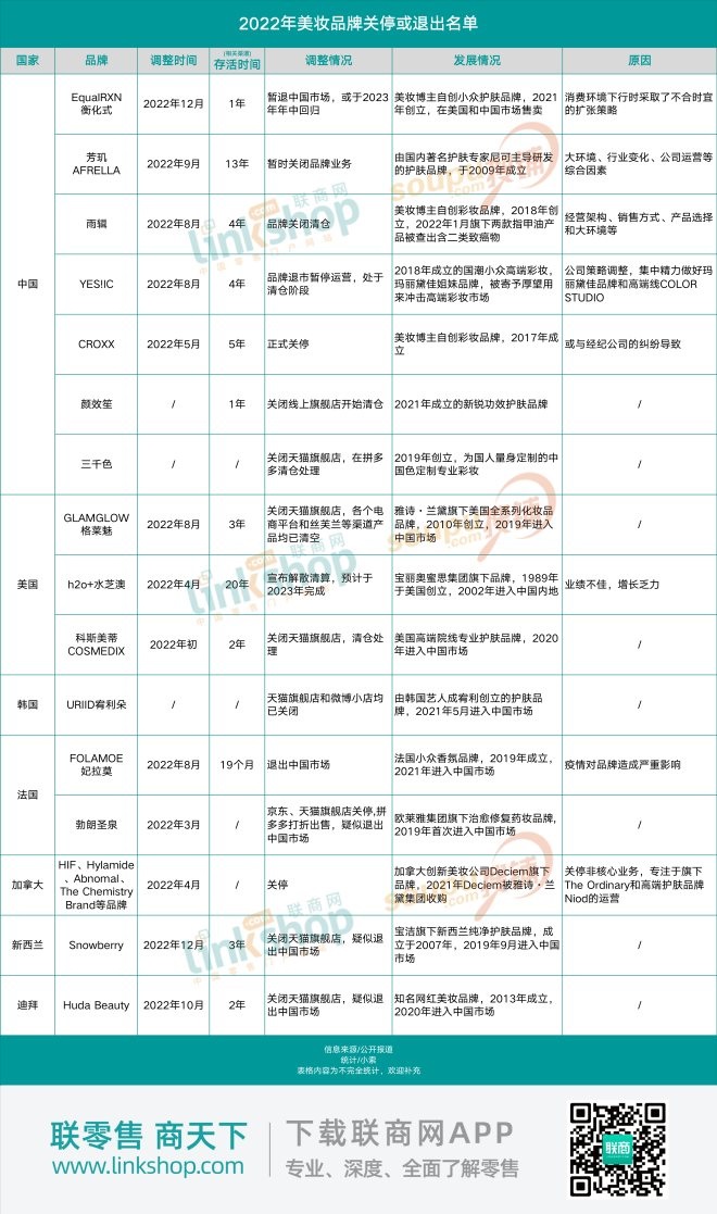 這些消失的美妝品牌不僅印證了2022年美妝行業(yè)的落寞,也在一定程度上從側(cè)面反映了市場更新迭代的趨勢。