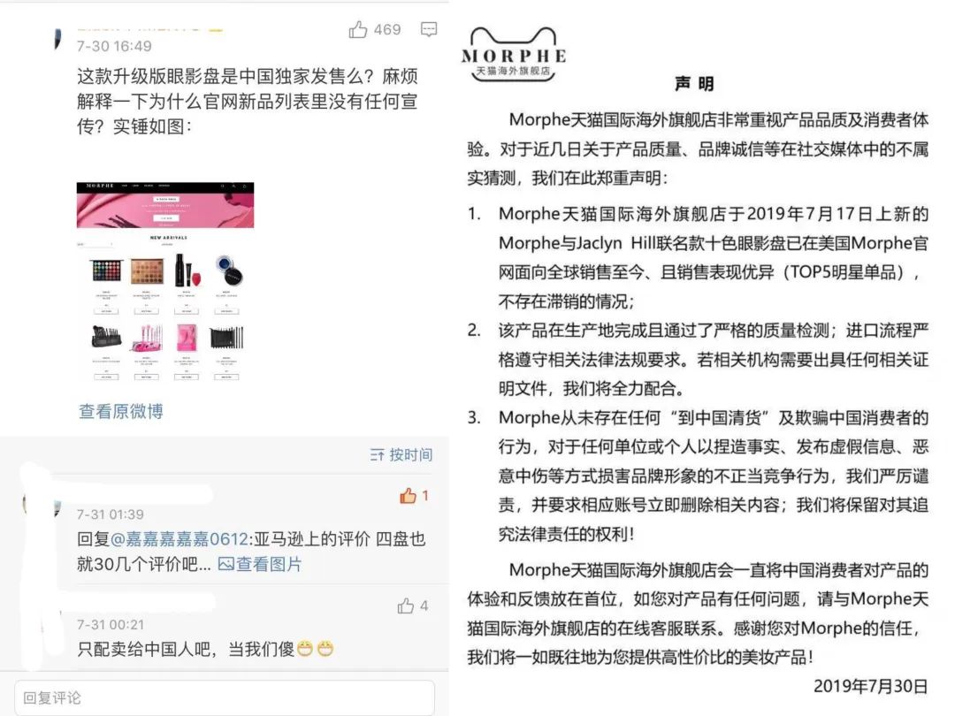 首先,海外網(wǎng)紅品牌所提供的產(chǎn)品有時并沒有贏得中國消費者的心。2019年時,美國網(wǎng)紅美妝Morphe品牌在中國市場借助KOL進行品牌和產(chǎn)品推廣。但一款Jaclyn Hill(國外美妝博主)x Morphe十色合作盤卻被曝出“在國外屬于品控不合格被召回的垃圾產(chǎn)品”。盡管Morphe天貓國際海外旗艦店隨后發(fā)聲明澄清,但消費者并不買賬,認為品牌在混淆概念。后來,該品牌店鋪消失在天貓國際中。