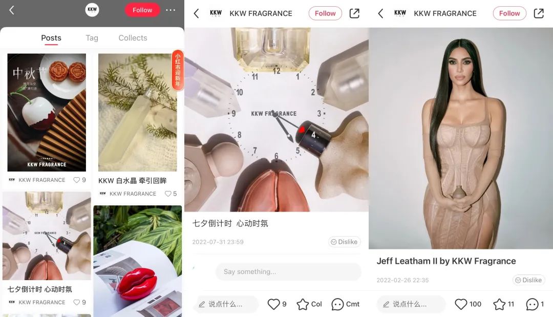 卡戴珊創(chuàng)辦的KKW Fragrance目前入駐了微博和小紅書兩個社交平臺,主要在平臺中發(fā)布產(chǎn)品圖片、銷售信息、“海外同款”的品牌/明星宣傳視頻,所配的文案比較平淡。同時,品牌的社交媒體更新頻率很低,2022年其小紅書一共只發(fā)布了17篇內(nèi)容。此外,品牌的運營主要以圖文和視頻為主,不會借助直播等新形式來加強消費者互動。整體來看,KKW Fragrance沒有進入中國消費者的語境之中,更多的只是在自說自話。