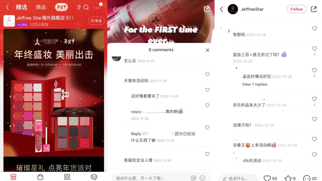 除了產(chǎn)品質(zhì)量以外,海外網(wǎng)紅品牌在中國飽受詬病的缺點還包括定價太高,有的品牌與國際大牌價格相當(dāng),但產(chǎn)品品質(zhì)卻不及后者;物流太慢,有的品牌必須要從海外發(fā)貨,中國消費者從下單到收貨可能要20至30天之久。海外網(wǎng)紅品牌在平臺中可供選擇的產(chǎn)品數(shù)量也比較少,Jeffree Star Cosmetics在京東國際、小紅書商城的產(chǎn)品數(shù)量僅個位數(shù),不少粉絲在社交媒體中抱怨“買不到自己想要的款式”。