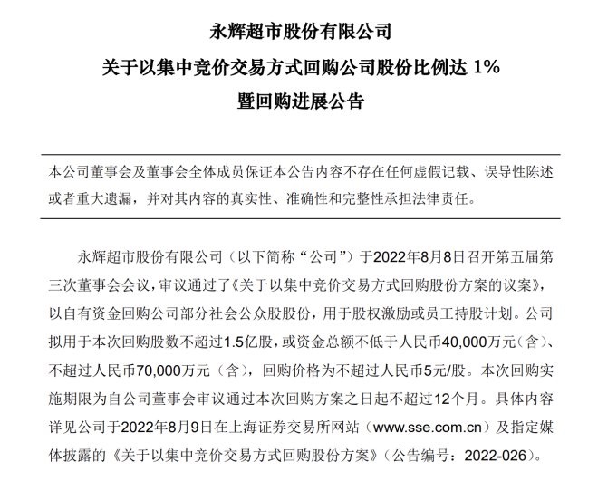 此前,永輝超市曾于2022年8月8日召開(kāi)第五屆第三次董事會(huì)會(huì)議,審議通過(guò)了《關(guān)于以集中競(jìng)價(jià)交易方式回購(gòu)股份方案的議案》,以自有資金回購(gòu)公司部分社會(huì)公眾股股份,用于股權(quán)激勵(lì)或員工持股計(jì)劃。永輝超市擬用于本次回購(gòu)股數(shù)不超過(guò)1.5億股,或資金總額不低于人民幣4億元(含)、不超過(guò)人民幣7億元(含),回購(gòu)價(jià)格為不超過(guò)人民幣5元/股。本次回購(gòu)實(shí)施期限為自公司董事會(huì)審議通過(guò)本次回購(gòu)方案之日起不超過(guò)12個(gè)月。