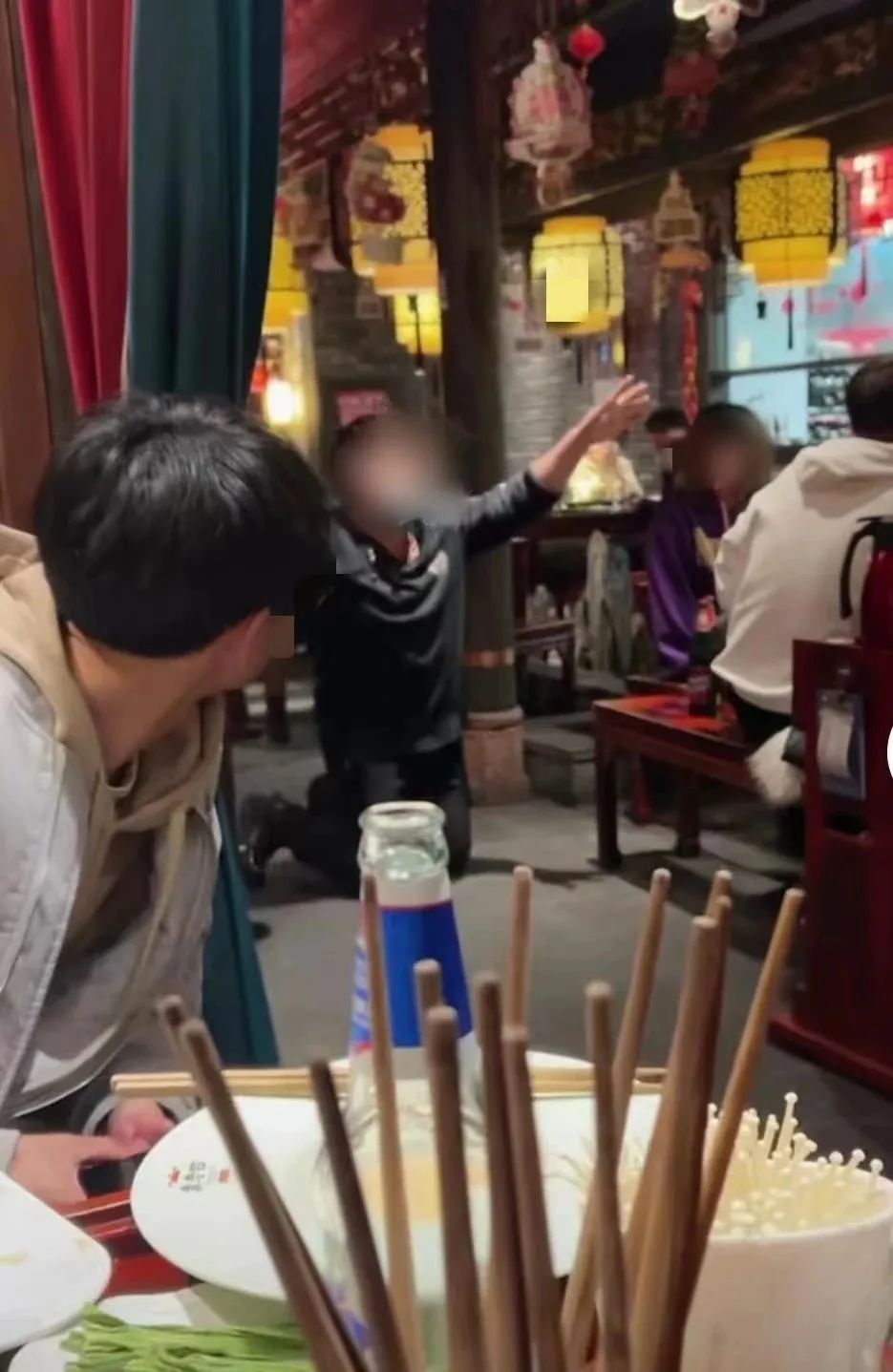 從視頻中可以看到,當時火鍋店坐滿了用餐的顧客,一名身穿黑色上衣的男子在火鍋店的大堂下跪,面對著其中一桌顧客。