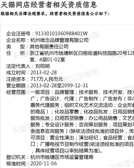 (天貓“李子柒旗艦店”店鋪資質信息)