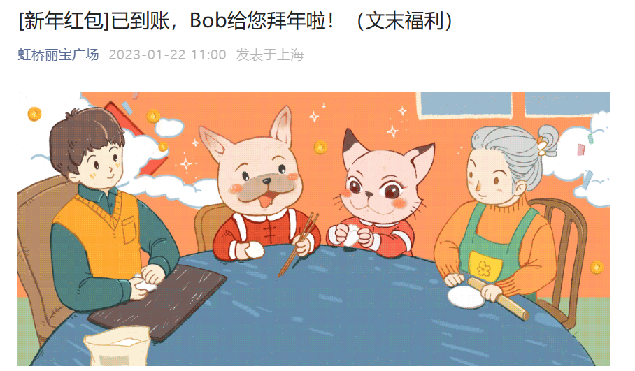 也有部分選擇在假期內(nèi)的除夕、初一發(fā)放。如上海虹橋麗寶廣場(chǎng),在正月初一1月22日當(dāng)天,以“拜年”形式發(fā)出的紅包封面。