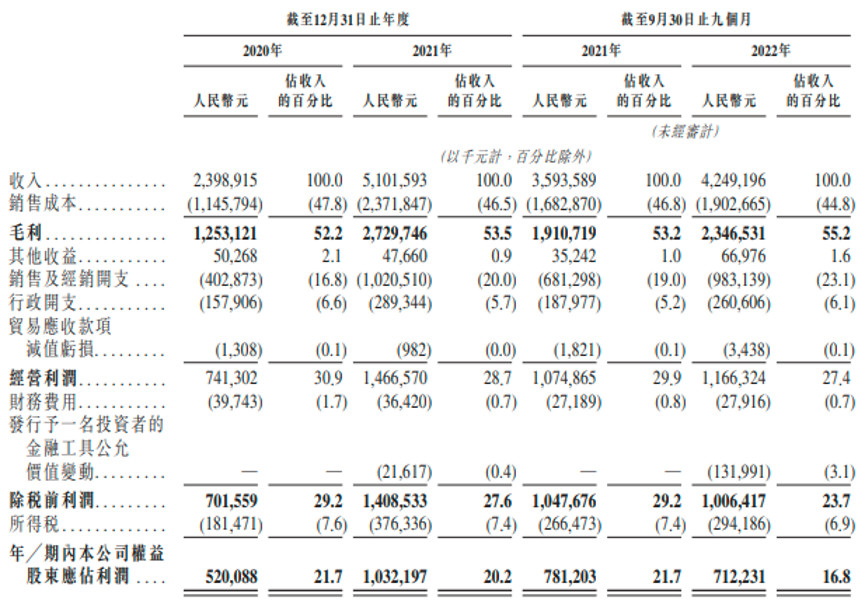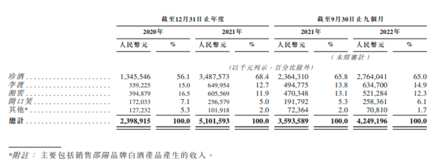 招股書顯示,2020年-2022年前9個(gè)月,珍酒李渡營(yíng)收分別為13.46億元、34.88億元、27.64億元,占總收入比例分別為56.1%、68.4%、65%。