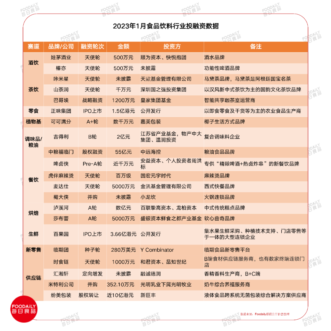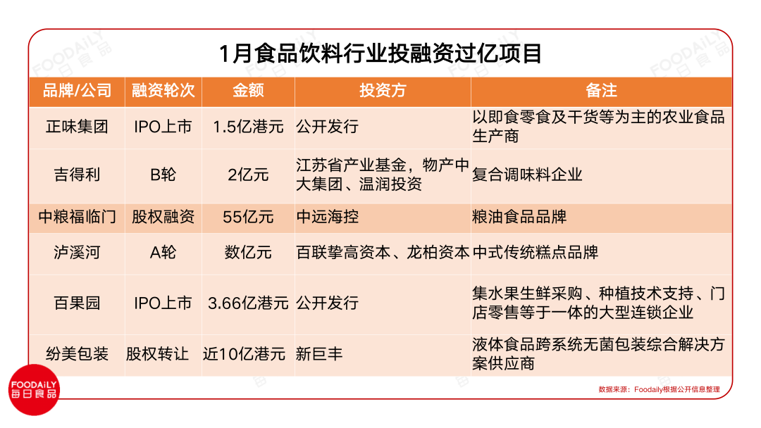 1月食品飲料投融資: