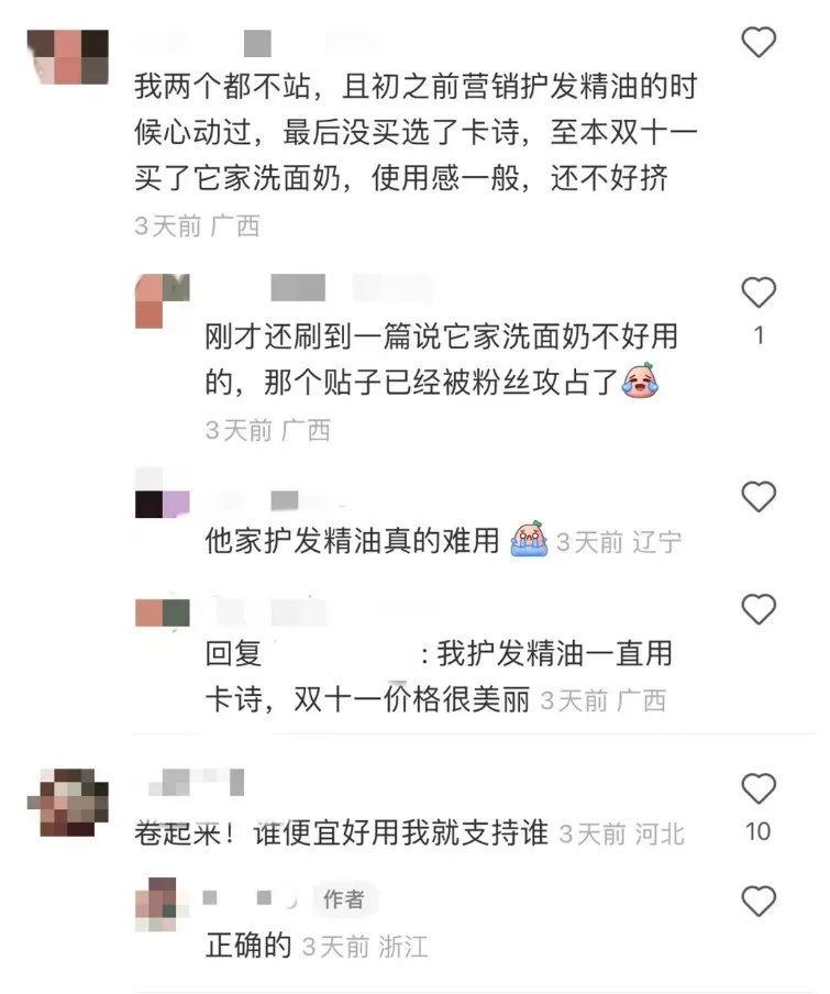 而消費(fèi)者則分化出三種態(tài)度:一批使用過(guò)且初和至本品牌的消費(fèi)者,因不同的使用感/效果/價(jià)格更偏向于其中一方;但更多人表示“持觀望態(tài)度,兩個(gè)都不站”;還有人說(shuō)“卷起來(lái),誰(shuí)便宜好用就支持誰(shuí)”。
