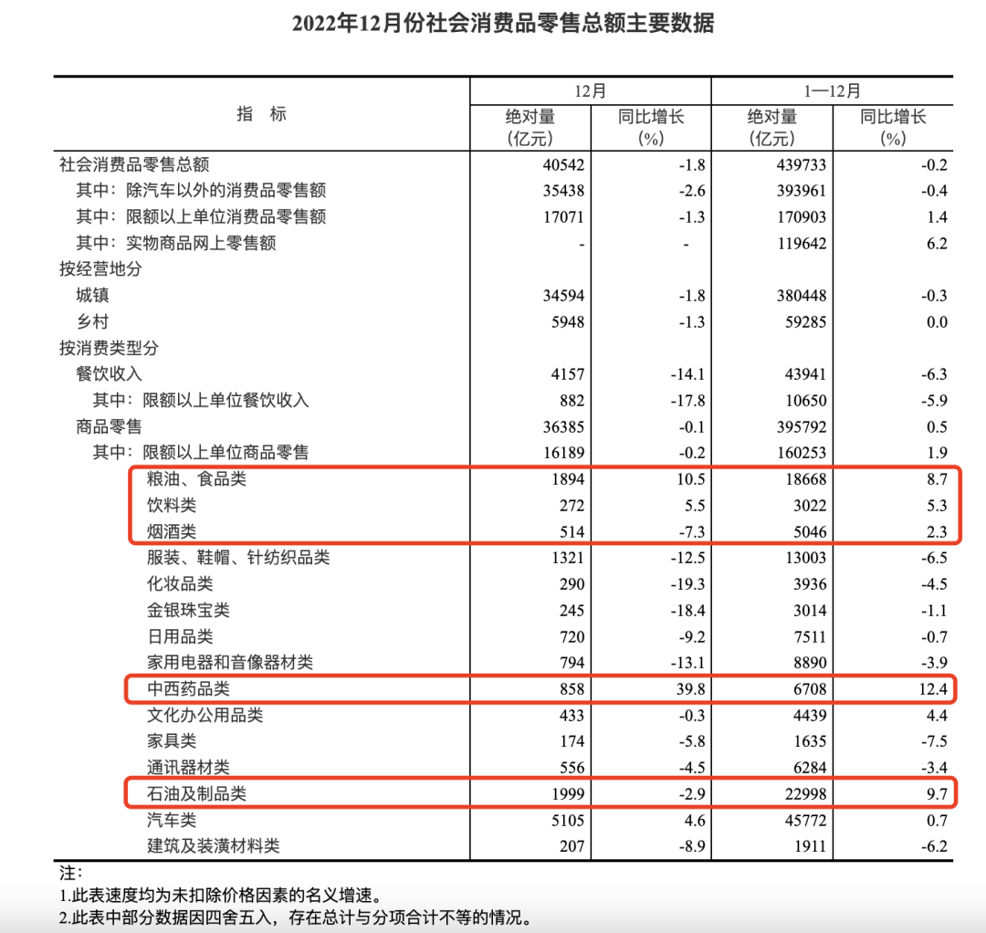 結(jié)合國(guó)家統(tǒng)計(jì)局公布的最新數(shù)據(jù)來看,2022年社會(huì)消費(fèi)品零售總額439733億元,比上年下降0.2%,扣除通貨膨脹因素,只比2019年疫情前的同期數(shù)值僅增長(zhǎng)了0.87%。分布到商品類目中,僅有食品飲料、煙酒等快消品還保持著良好增長(zhǎng)勢(shì)頭,這也是過去新消費(fèi)品品牌較為集中的領(lǐng)域,醫(yī)藥、石油及制品類考慮到疫情和原材料漲價(jià)等因素,就不展開了。此外,去年餐飲消費(fèi)同樣慘遭“滑鐵盧”,2022年全國(guó)餐飲收入43941億元,同比下降6.3%。