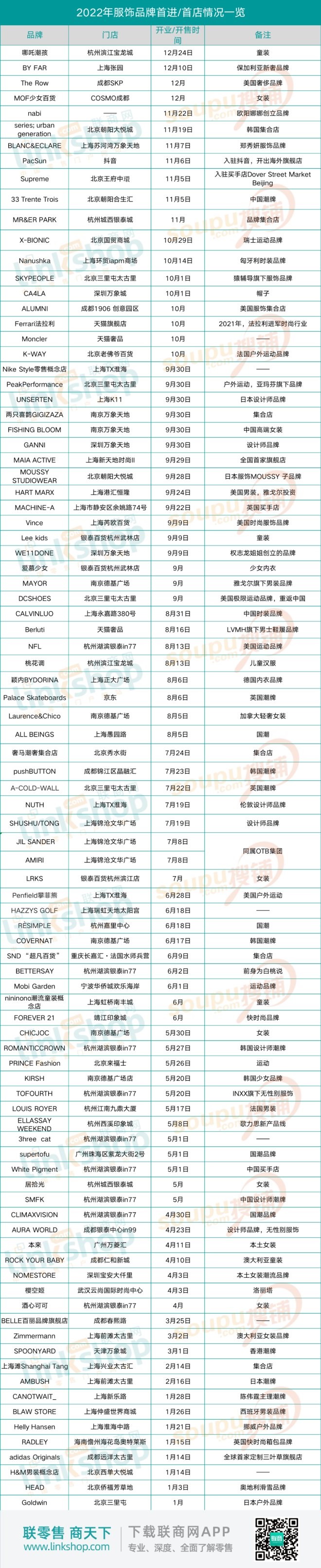 據(jù)《聯(lián)商網(wǎng)》不完全統(tǒng)計,2022年,有92個服飾品牌在中國市場開出首店或創(chuàng)新門店。