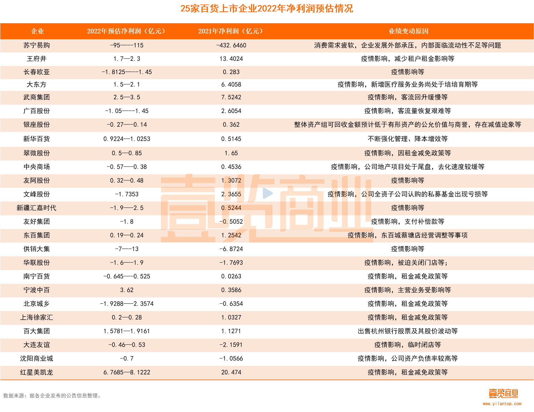 百貨方面,25家企業(yè)中,預計2022年實現(xiàn)盈利的的有11家,占比44%。按公告數(shù)據(jù)顯示,其余14家預計總虧損在116.46—143.46億元區(qū)間。