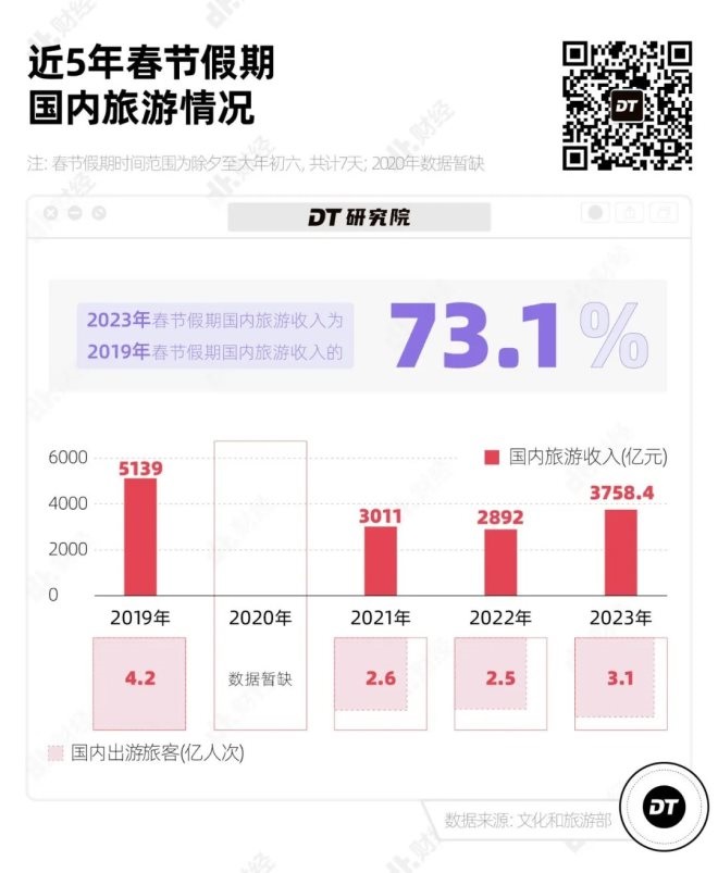 但旅游的消費(fèi)力恢復(fù)度就稍弱些,2023年春節(jié)假期國(guó)內(nèi)旅游收入為3758.43億元,是2019年同期(5139億元)的73.1%。
