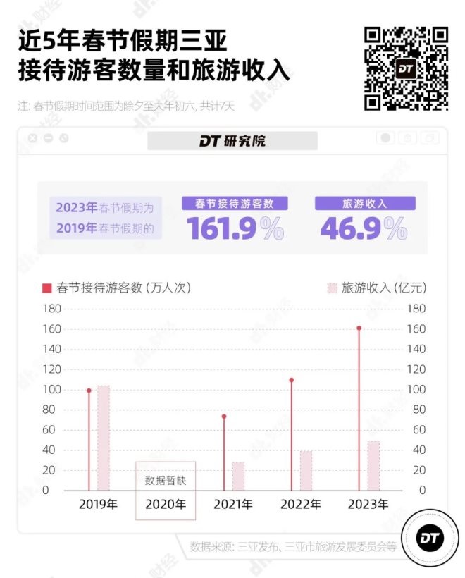 全國(guó)出游人次離疫情前還有差距的大背景下,三亞2023年春節(jié)假期接待游客數(shù)已經(jīng)是2019年同期的1.62倍,達(dá)到161.29萬人次。