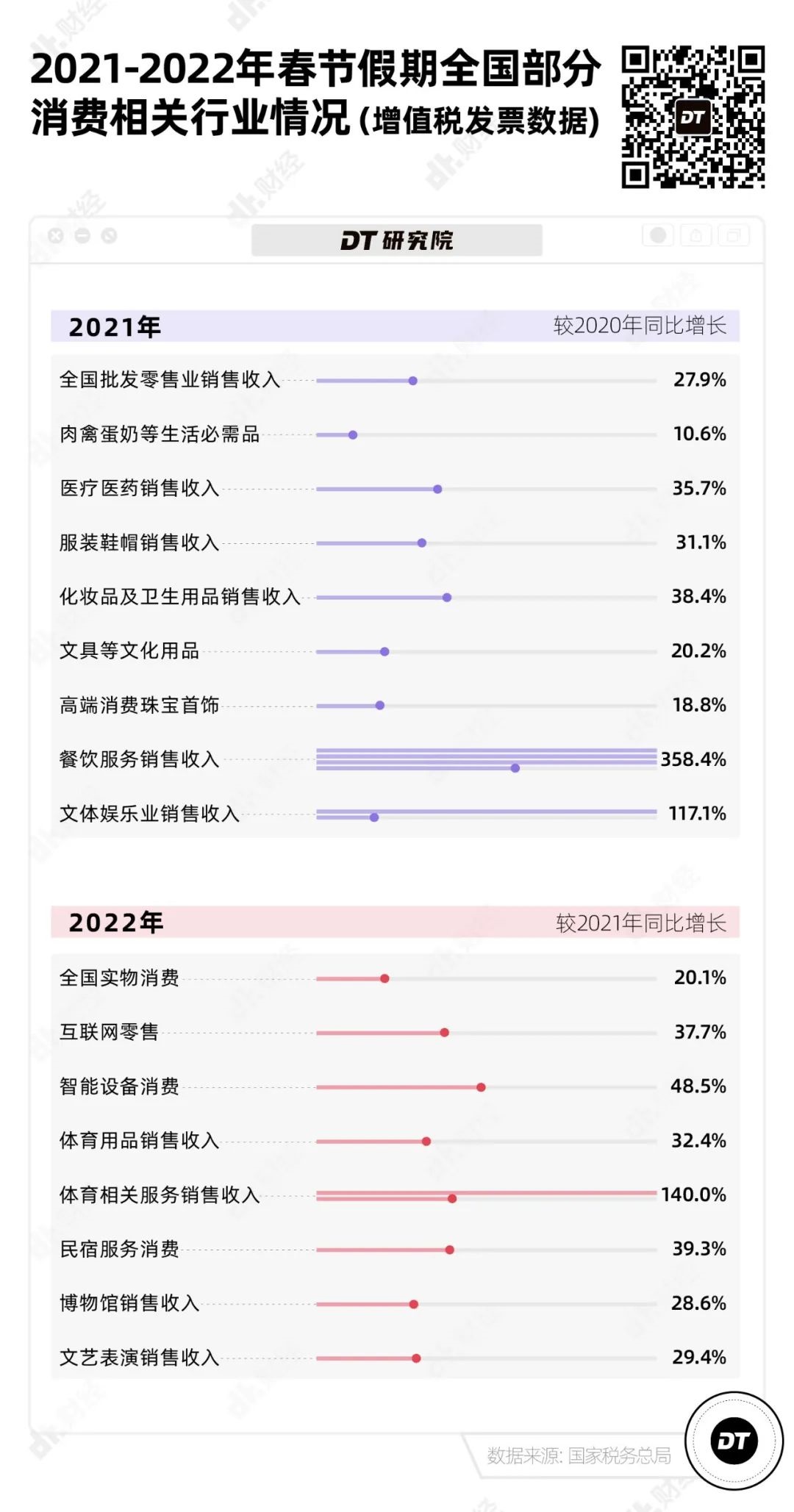 2020年是突然受挫的,疫情恐慌情緒重,許多數(shù)據(jù)大跳水,疫情暫時(shí)穩(wěn)定后的2021年春節(jié),情緒修復(fù)、信心回歸,消費(fèi)上升幅度很大,尤其是與線下相關(guān)的餐飲服務(wù)和文體娛樂業(yè)銷售收入,翻倍上漲。服裝、化妝品和高端消費(fèi)珠寶這類在之后被認(rèn)為是享受類非必要消費(fèi)的行業(yè),也成為這一年的消費(fèi)增長(zhǎng)亮點(diǎn)。