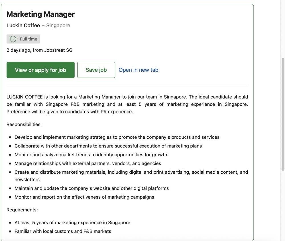 2月1日,在新加坡最大的兩個招聘網(wǎng)站Jobstreet和JoBsDB上,瑞幸更新了在新加坡的招聘崗位:最新消息顯示,瑞幸將在新加坡繼續(xù)尋找市場經(jīng)理,該角色不僅將制定、執(zhí)行新加坡市場營銷策略,也將負責市場洞察并拓展增長機會。
