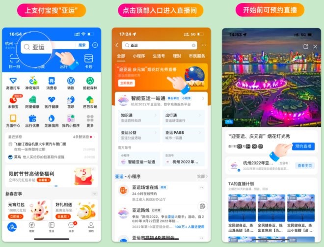 上支付寶搜“亞運(yùn)”,進(jìn)入智能亞運(yùn)一站通小程序,看煙花秀直播,期間還有兩波抽獎(jiǎng)將送出精美杭州亞運(yùn)會(huì)周邊好禮。