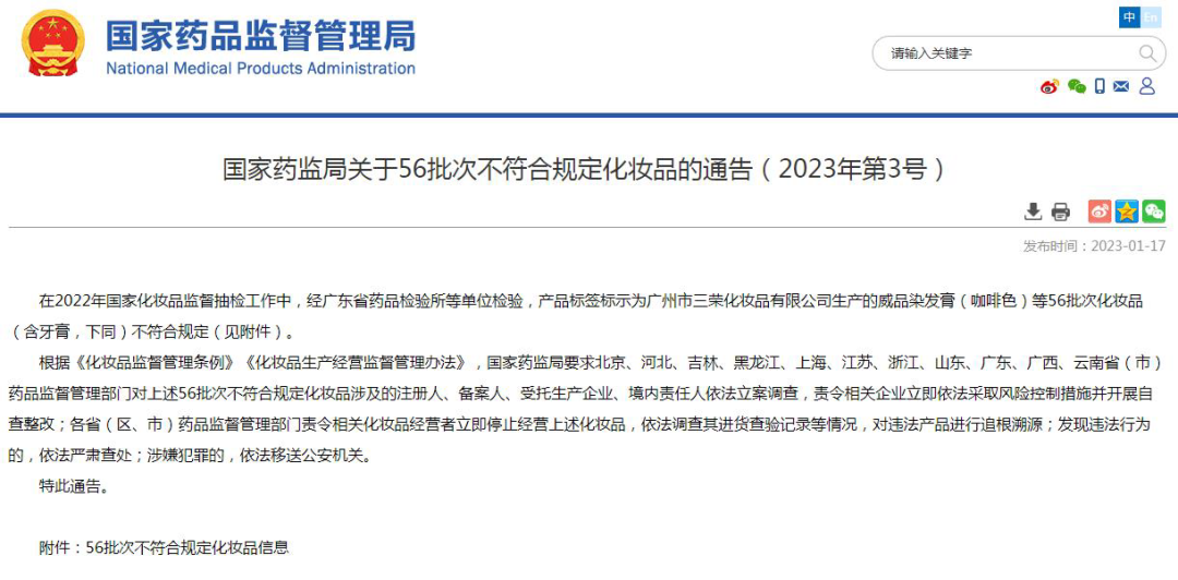 而在此之前,1月17日,國(guó)家藥監(jiān)局還公布《關(guān)于56批次不符合規(guī)定化妝品的通告》。短短1個(gè)月內(nèi),已有126批次產(chǎn)品被檢出不合規(guī)。