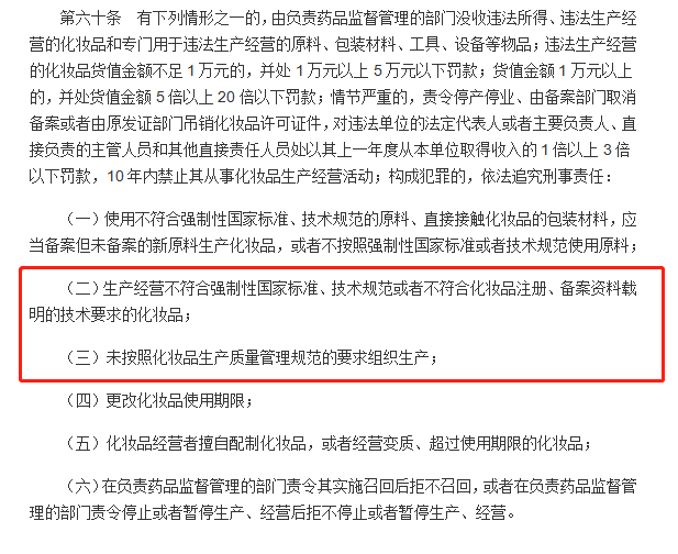 廣州荃智美膚生物科技研究院研發(fā)總監(jiān)張?zhí)姼嬖V青眼,不合規(guī)產(chǎn)品和假貨即屬于《化妝品監(jiān)督管理?xiàng)l例》(下稱新條例)中第六十條中所指出的“生產(chǎn)經(jīng)營(yíng)不符合強(qiáng)制性國(guó)家標(biāo)準(zhǔn)、技術(shù)規(guī)范或者不符合化妝品注冊(cè)、備案資料載明的技術(shù)要求的化妝品”“未按照化妝品生產(chǎn)質(zhì)量管理規(guī)范的要求組織生產(chǎn)”的情形,涉事企業(yè)將會(huì)被處罰。