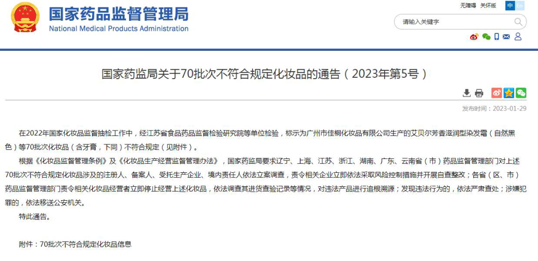 根據(jù)國(guó)家藥監(jiān)局1月29日發(fā)布的《關(guān)于70批次不符合規(guī)定化妝品的通告》顯示,美度染發(fā)膏、新派染發(fā)膏(自然黑色)、章華生態(tài)焗油染發(fā)霜(3.3)、宮中秘策爽防曬乳液SPF50 PA+++、PINKY凡士林煙酰胺臻養(yǎng)潤(rùn)膚膏、怡人雅洗發(fā)液、片仔癀深抗敏專效深養(yǎng)牙膏等70批次化妝品(含牙膏,下同)不符合規(guī)定。