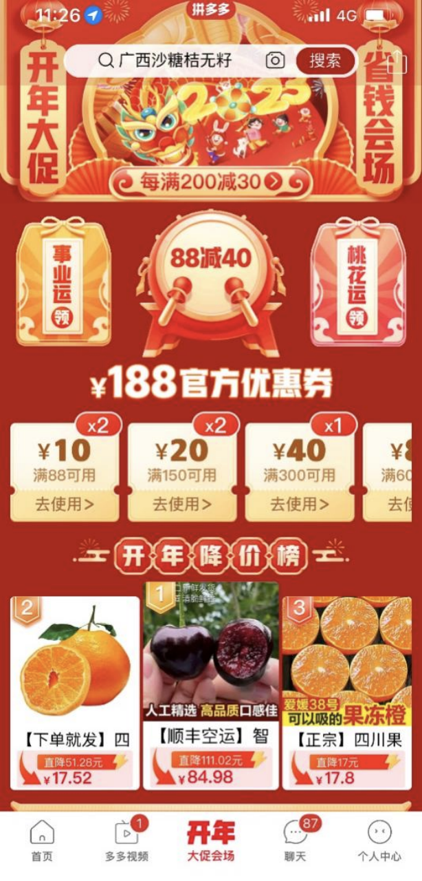 在開(kāi)年大促中,拼多多特地為消費(fèi)者發(fā)放了188元的開(kāi)年紅包,針對(duì)不同的購(gòu)物需求提供多張滿(mǎn)減優(yōu)惠券。在此基礎(chǔ)上,平臺(tái)還推出了每滿(mǎn)200減30、整點(diǎn)發(fā)券、大額折扣等多重福利,全面覆蓋農(nóng)副產(chǎn)品、日用百貨、美妝母嬰、運(yùn)動(dòng)戶(hù)外、3C數(shù)碼等全域消費(fèi)品。