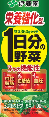 伊藤園也推出了“一天的蔬菜”蔬菜汁,含有三十種蔬菜,聲稱具有“抑制餐后中性脂肪上升”、“抑制餐后血糖值上升”、“降低血壓”等三重作用,核心成分是抗性糊精和GABA。