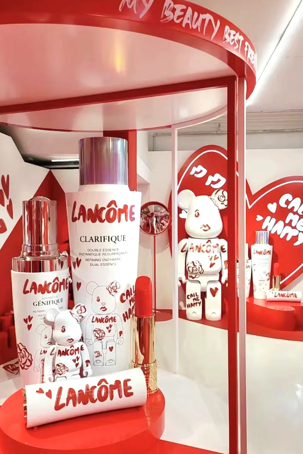 開藝術(shù)展其實上是歐美大牌美妝常用的營銷手段。蘭蔻在2022年就開了兩個以現(xiàn)代藝術(shù)為主的藝術(shù)展。一個是9月份在上海愚園百貨商店,與藝術(shù)寵兒BE@RBRICK跨界推出的CALL ME HAPPY潮妝快閃店?扉W店整體以高飽和度和高對比度的紅白配色為主色調(diào),外墻上的蘭蔻標(biāo)志性玫瑰,強調(diào)了聯(lián)名品牌的特點。