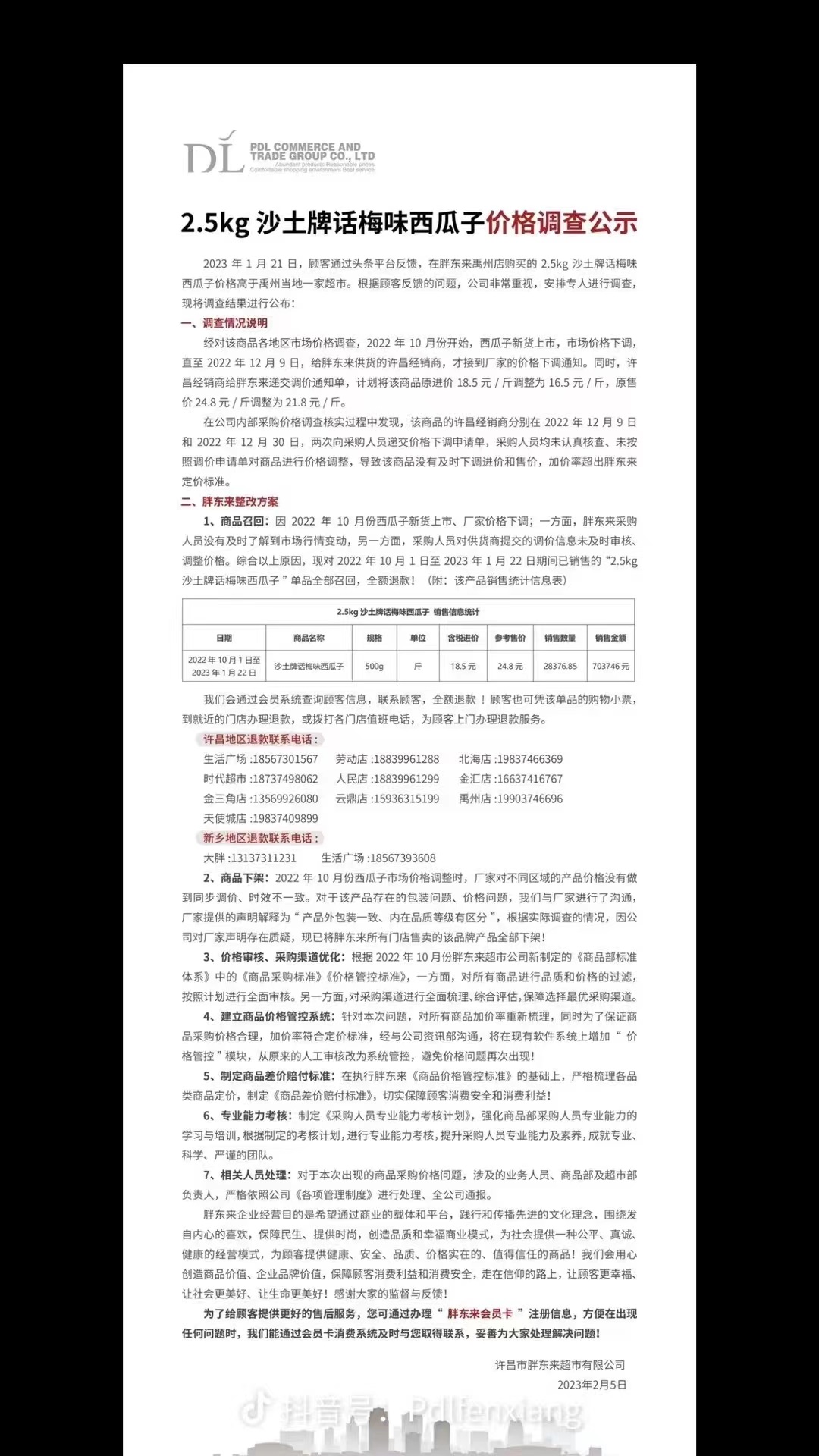 2、商品下架:2022年10月份西瓜子市場價格調(diào)整時,廠家對不同區(qū)域的產(chǎn)品價格沒有做到同步調(diào)價、時效不一致。對于該產(chǎn)品存在的包裝問題、價格問題,我們與廠家進行了溝通,廠家提供的聲明解釋為“產(chǎn)品外包裝一致、內(nèi)在品質(zhì)等級有區(qū)分”,根據(jù)實際調(diào)查情況,因公司對廠家的聲明存在質(zhì)疑,現(xiàn)已將胖東來所有門店售賣的該品牌產(chǎn)品全部下架!