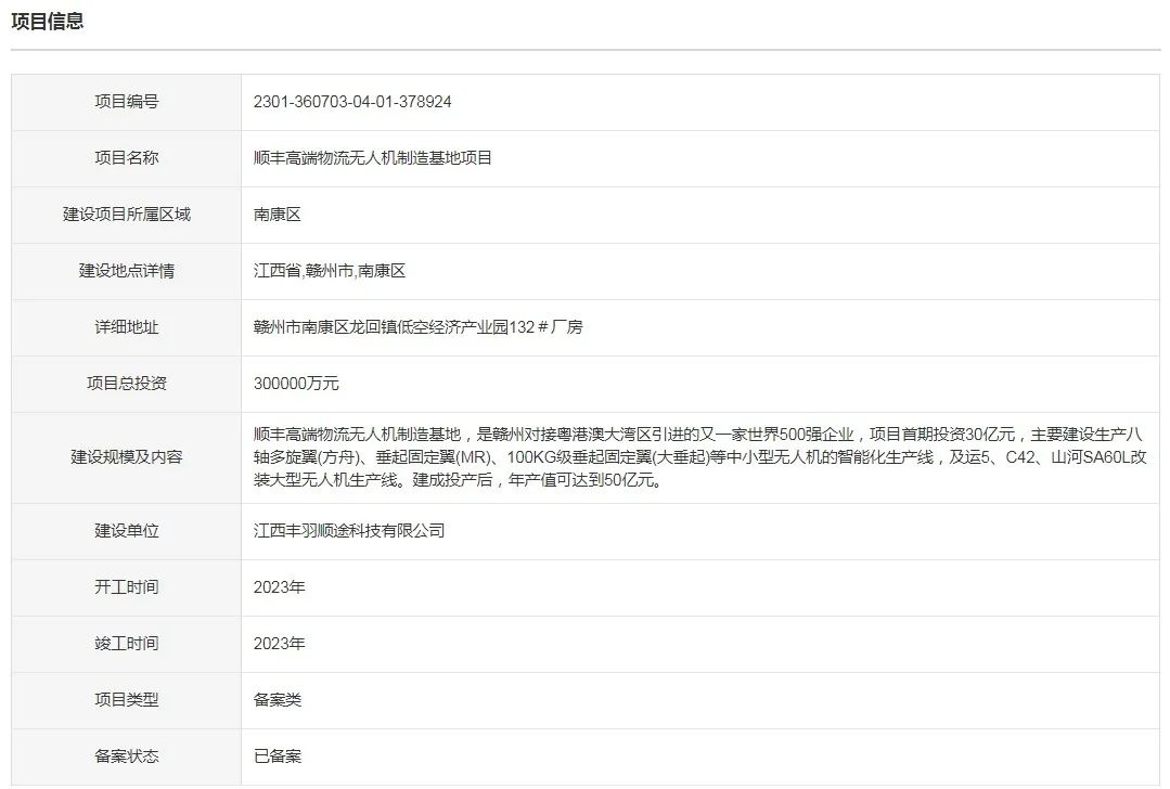 近日,順豐高端物流無人機制造基地項目正式備案。地址位于江西贛州,項目首期投資30億元。建設單位為江西豐羽順途科技有限公司,由順豐子公司豐翼科技(深圳)有限公司全資控股。2023年項目開工,預計年內(nèi)竣工。