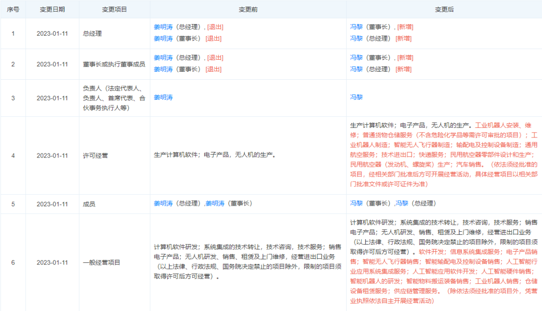 值得一提的是,今年1月,豐翼科技(深圳)有限公司發(fā)生了大規(guī)模工商變更。不僅董事長、總經(jīng)理職位出現(xiàn)變動,其經(jīng)營范圍還新增了通用航空服務、快遞服務、民用航空器(發(fā)動機、螺旋槳)生產(chǎn)、智能無人飛行器銷售等等。許可信息也新增了通用航空企業(yè)經(jīng)營許可證、快遞業(yè)務經(jīng)營許可證等。