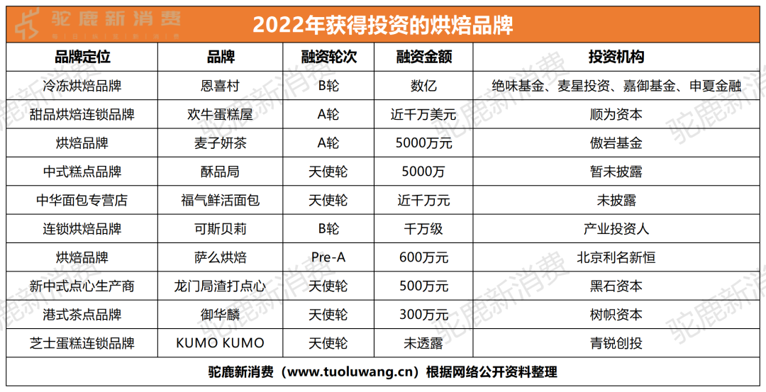 根據(jù)駝鹿新消費(fèi)不完全統(tǒng)計(jì),2022年共有10家烘焙品牌獲得融資,根據(jù)已披露融資金額的企業(yè)估算,總計(jì)獲得超過5.01億元的融資。