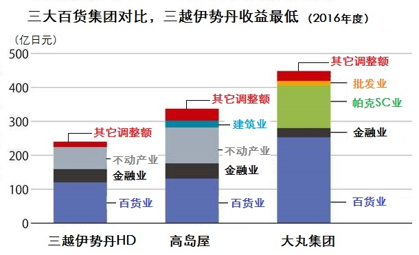 從2016年三大百貨集團綜合收益比較看,三越伊勢丹收益最低(見圖示)。