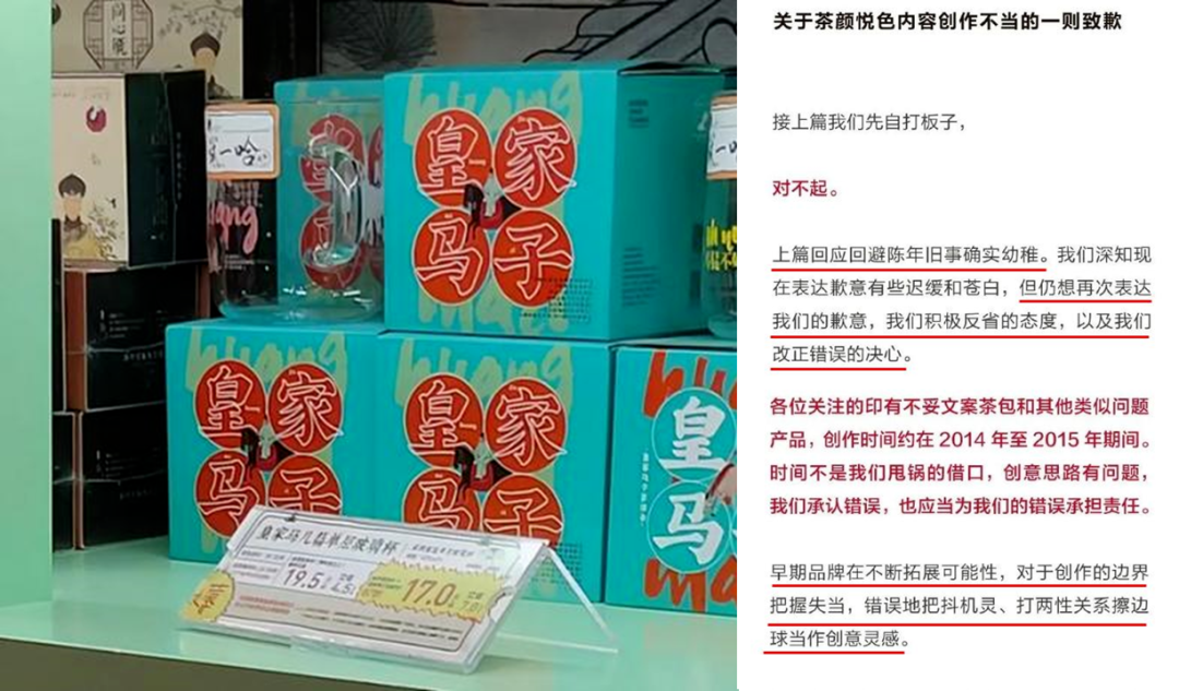 茶顏悅色也曾在周邊上敗了一些好感。早期販賣的杯子上印著”撿簍子”,包裝盒上寫著“皇家馬子”,將抖機靈、打兩性關(guān)系擦邊球當作創(chuàng)作靈感。